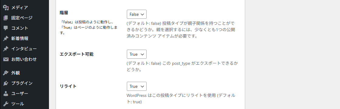 カスタム投稿をエクスポートしたい場合は該当の投稿タイプの「エクスポート可能」をTrueにしておく。