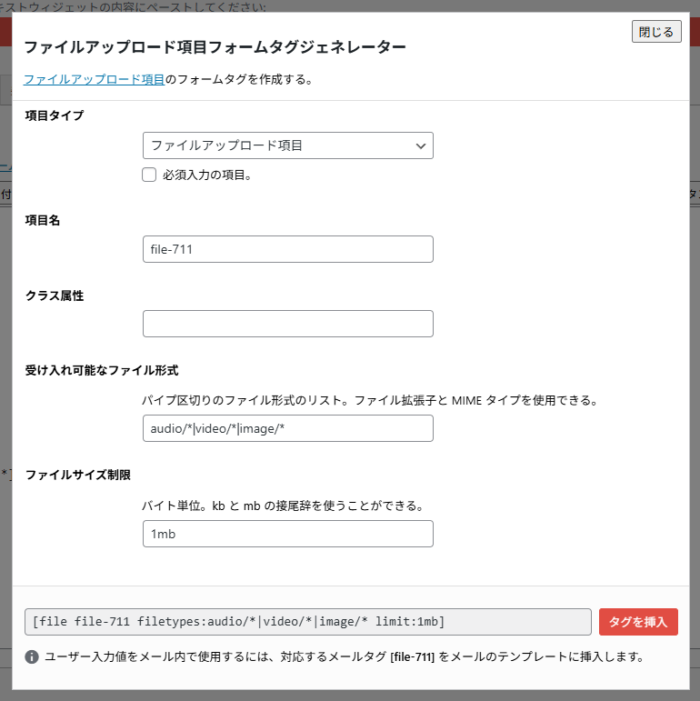 普段と同じで、中身を設定したら「タグを挿入」をクリック。